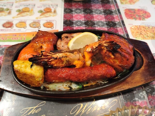 カレー二種、サラダ、ドリンク、タンドリーチキン、シーカバブだったっけ・・、にライスかナン。
