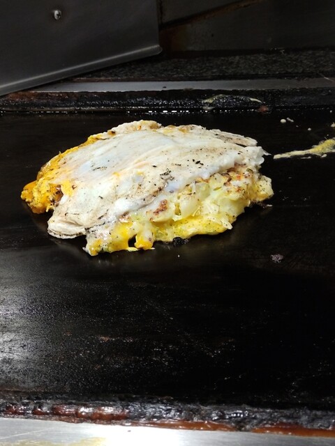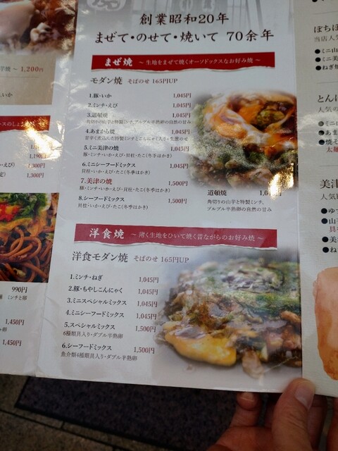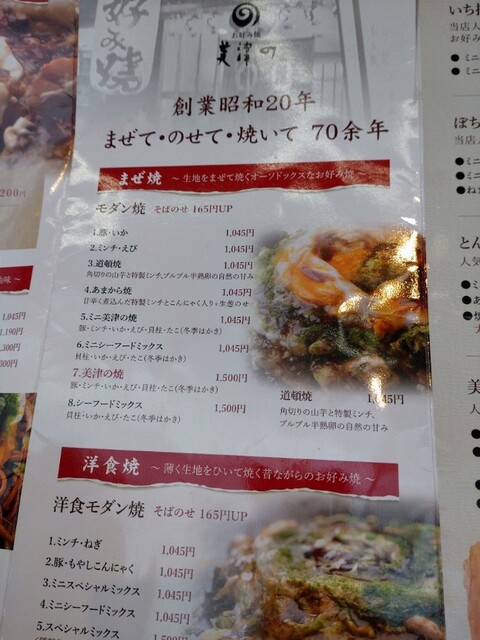 お店の看板商品混ぜ焼きの美津の焼きとモダン焼きのシーフードミックスを注文。