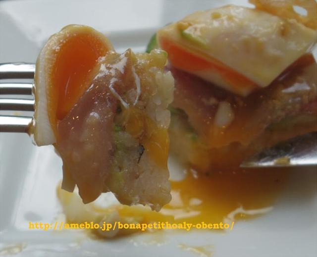 オーガニック卵、アボカド、マグロ、レンコンチップス、