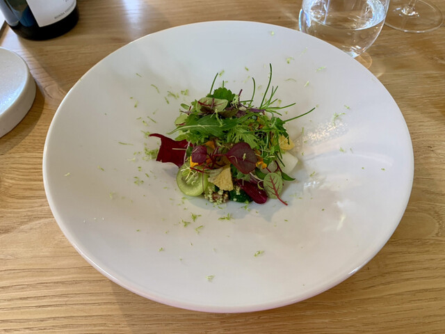 次は秋野菜と果物のタブレ…フルーツや野菜を爽やかなドレッシングとクスクスで和えたとても美しい一皿☆で甘み酸味塩気のバランスが絶妙です⤴︎最後にかけられたライムだかグリーンレモンのゼストが本当に良い香りで美味しい美しいお料理でした