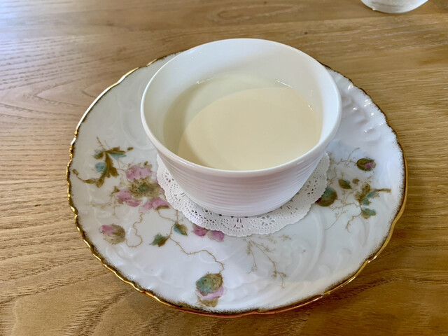 付け合わせのガスパチョは透明な仕上がりだけどちゃんとガスパチョ…夏野菜は使っているけどキュウリっぽさやニンニクっぽさが無くスッキリ美味しい食べる冷たいスープでした