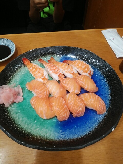 お好みすしサーモン八貫(山葵抜き)、お好みすしエビ四貫(山葵抜き)