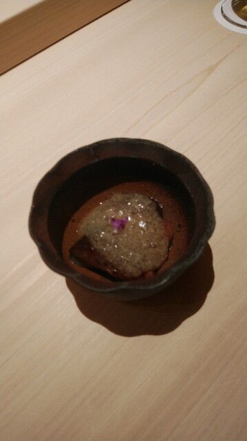 二神島の鮑、水だけで6時間煮込んでいるそうです。鮑の肝ソースに付けて味わいます。絶妙な歯ごたえで鮑そのものの味わいを楽しめます。この時に鮑の肝ソースを少し残しておくように言われました。相方も鮑の歯触りと旨みをかなり気に入っていました。
