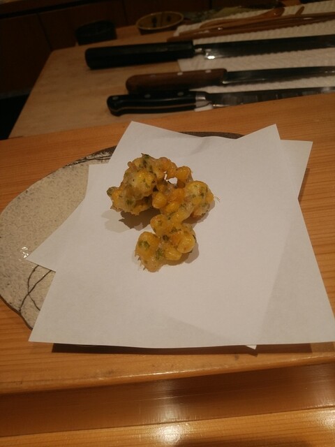 トウモロコシと生姜のかき揚げ、サクッとした口当たり、トウモロコシの甘みと生姜のキレのある旨みがはまります。高知のあおさ海苔も入っていて風味がいいですね。相方もサクッとした口当たりで旨みをかなり喜んでいました。