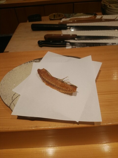徳島の鮎の一夜干し、内臓を裏ごししたソースを塗って干してあるそうです。パリパリッと豊潤な旨みがたまりません。横には京都の万願寺唐辛子も添えられています。こちらもしっとりと甘みを感じます。相方も鮎の旨みをかなり気に入ってました。