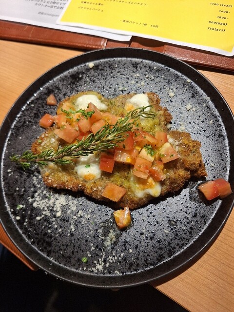 香草パン粉の 豚ロースのミラノ風チーズカツレツ、香草パン粉の風味と香ばしさが食指を動かしてくれます。豚ロースは柔らかく、チーズの旨みやトマトの酸味も良く馴染みます。