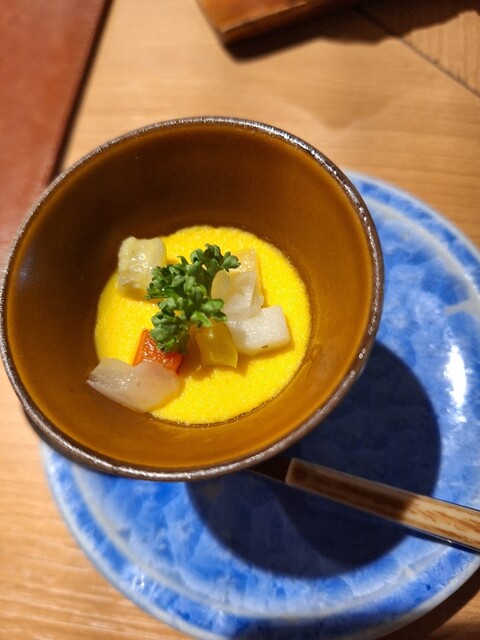 お通しとしてカボチャのフランが着ました。洋風の茶碗蒸しでカボチャの甘みがはまります。