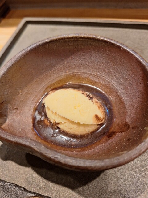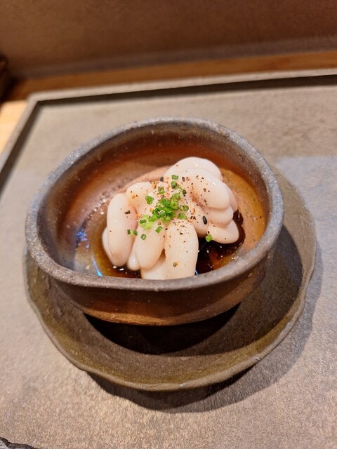 真鱈白子自家製ポン酢と黒七味、口の中でとろけます。クリーミーな味わいです。それを自家製ポン酢がサッパリと味あわせてくれます。後から黒七味がピリッときます。