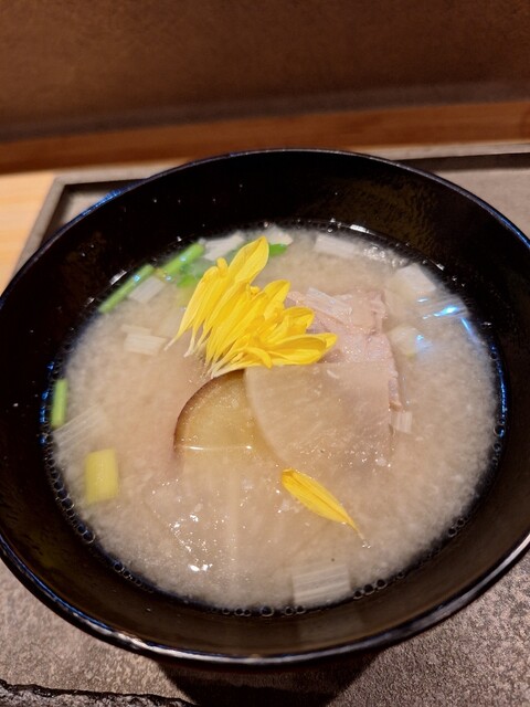 最初に鳴門金時豚と鳴門金時の粕汁、鳴門金時豚、鳴門金時、大根、ネギ等が入っていて上からエディブルフラワーが散りばめられています。鳴門金時豚はムギュッと旨みが良く、鳴門金時はまろやかな甘み、大根はホロホロです。粕汁の優しい味わいに良く馴染みます。