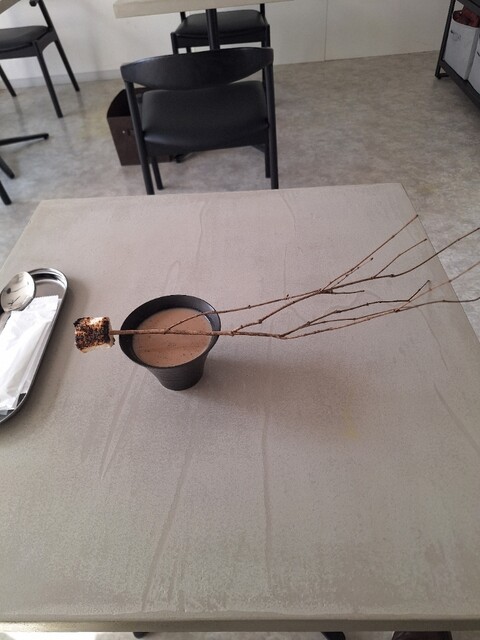 まず焚き火チャイが着ました。スパイスが効いていて奥深い甘みと風味。焚き火の香りもします。焼きマシュマロをディップしてしっとり味わいました。
