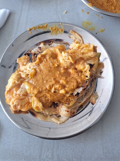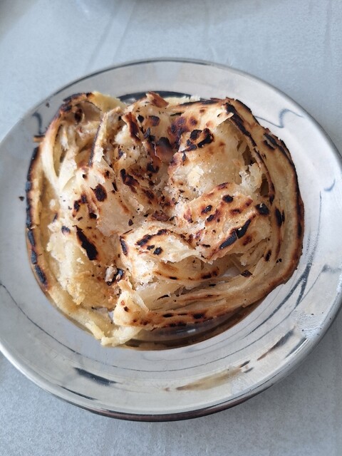 ファットマン•チキンマサラ、辛さはなくまろやかなコクとスパイスが奥深い。店主に勧められた食べ方のパロタにカラッキという半熟インドオムレツを乗せてファットマン•チキンマサラをかけて味わいました。トロッとしたカラッキにサクッとしたパロタ、まろやかなファットマン•チキンマサラが良く馴染みます。パロタは単体で食べるとデニッシュやクロワッサンのようにサクッとしています。