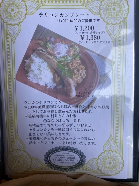 冬に美瑛に来た時から気になっていたお店です。オーダーはチリコンカーンのランチにしました。ソーセージは普通サイズにしましたがじゅうぶんな量です。美味しいですが夜営業がないらしいです。夜も来たいと思うお店です。