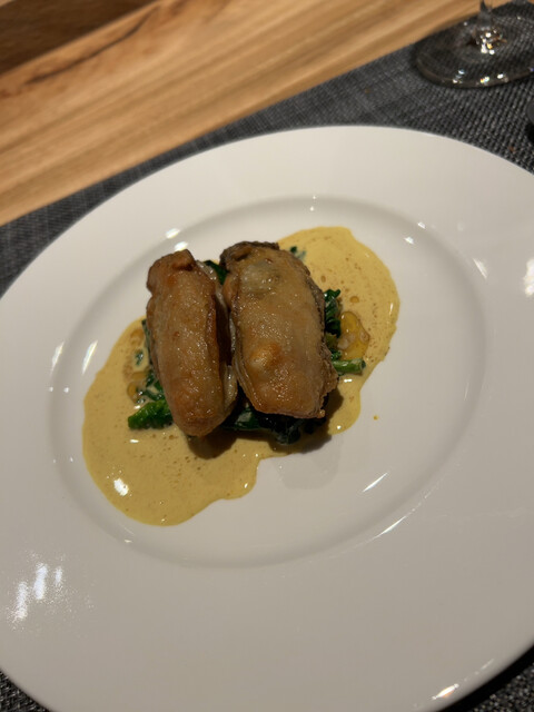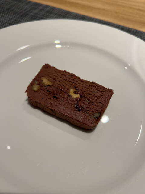 前菜はスモークサーモン。えらく気前の良い盛りっぷりですが、味も間違いなく美味しいです。これはシャンパンでも良かったかも(シャンパン好きじゃないですけど)。冷前菜はフォアグラ入りのパテ。これもリッチな口当たりでお酒が進みます。肉感もしっかりしていて、レストランらしいパテの美味しさを再認識できたと思います。温前菜1品目はオマール。このオマールの火入れがレアなのに食べやすくて、美味しかったです。これは初めて食べたくらいの火入れのディレクションだったので、かなり驚きました。白菜と枝豆で彩りを出しているところも、目に楽しくて良かったです。温前菜2品目は牡蠣のムニエルにカレークリームソース。修業先のスペシャリテですが、これも美味しかったです。気のせいかクリーム感を強めにしているところが好みにぴったりだったので、余計に印象が良かったです。しかも寒い日だったせいか、牡蠣を激アツの状態で出してくれたのも嬉しかったです。魚はアマダイとホタテとリゾットのてんこ盛り。これも美味しかったです。上に載っている青いものも風味がよくて、皿全体の良さが引き立っていました。メインは仔羊。塩とハーブと火入れで勝負っぽく見えますが、ニンニクが2粒も入っているのでパンチが効いてワインが美味しかったです。デセールにチョコレートのテリーヌ。これもしっかり目のボリュームで、丁寧に作っているせいか最後まですごく美味しかったです。