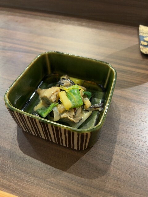 ツブ貝 カマスの棒寿司 カラスミとカブ もずく酢