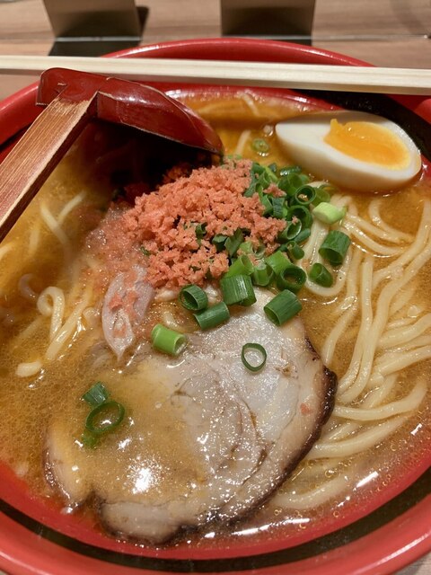 なんとか注文を終え、待つこと5分強で、えびみそラーメン登場です!まずは注目のスープを飲んでみると、これは初体験のガッツリ海老の風味を感じる濃厚な海老エキスのスープで、衝撃の美味さでした!この濃厚な海老スープには、やはり太麺で正解でしたね!スープがよく絡んで最高でした!まさかの空港で、こんな美味しいラーメンに巡り合えるとは思わなかったので、ラッキーでした!これは並んでも食べたい一品ですね!次回は、このスープに浸して食べたいおにぎりも頼もうと思います!