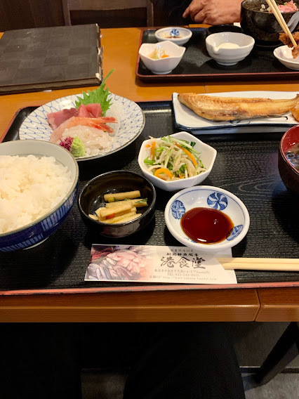 すると以外と早く提供されてきました。この日本海定食には、1人では十分すぎる刺身の盛合せと、ホッケ焼き、サラダ、小鉢、ご飯、味噌汁が付くという、コストパフォーマンス抜群の定食でしたね!