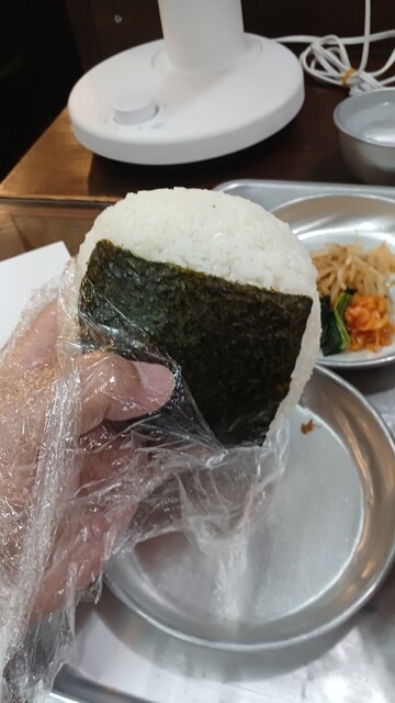 運ばれてきた給食には、昔ながらの醤油ラーメンと普通のおにぎり二個分はある大きさ、ナムルのような漬け物と、ラムネもついています。