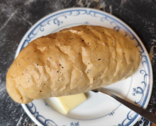 今回初めて、「バジル入りフランスパン」をオーダーしました。大きくてびっくり。表面はパリッとしていますが、ホカホカふんわりとした生地に、バジルが練り込んであります。パンだけのテイクアウトがあったら、欲しい位でした。