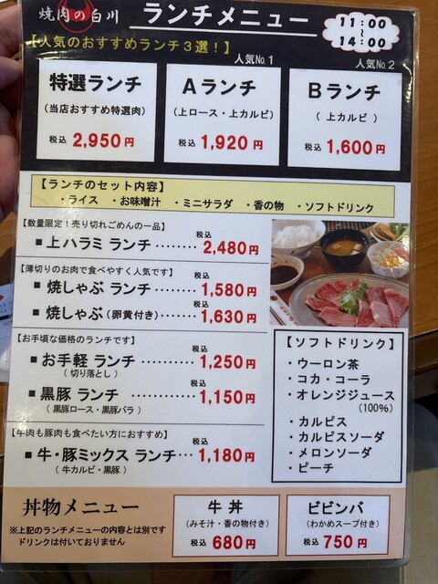 ランチと単品がありBランチ1600円は上カルビ、ライス、味噌汁、サラダ、漬物、ドリンク。