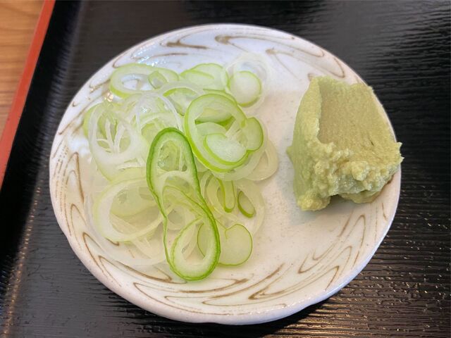 らいただきます、そば汁自体は私的には丁度好い醤油加減です。更に途中にわさびを麺に