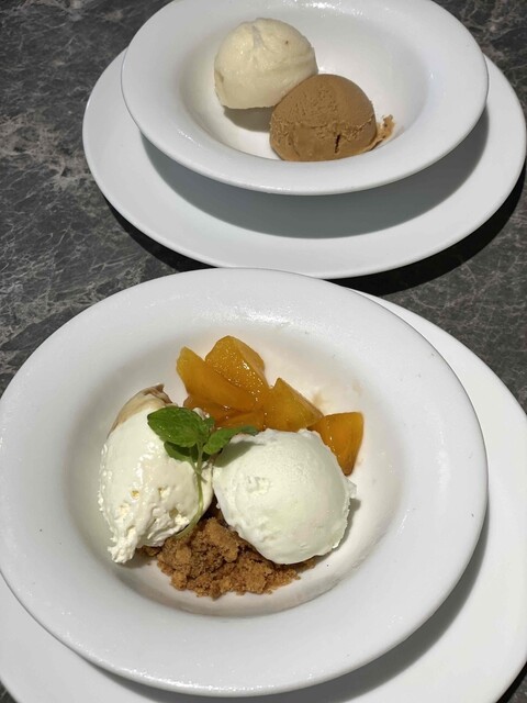 デザートは、手前が私の「クレームダンジュ季節のフルーツソース」、奥が連れが頼んだ「レックスベリーより本日のジェラート」。