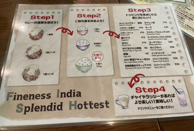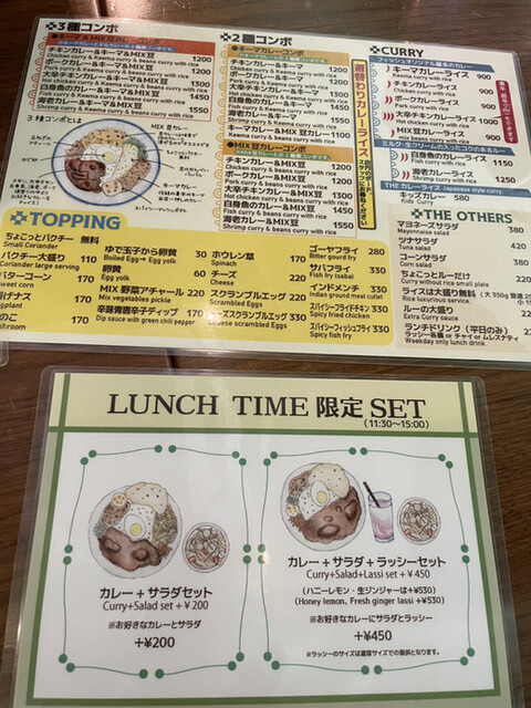単品のカレーと、2種類のカレーが楽しめるコンビネーションがあるんですね。色々食べたいので、この時点で私はコンビネーション一択!