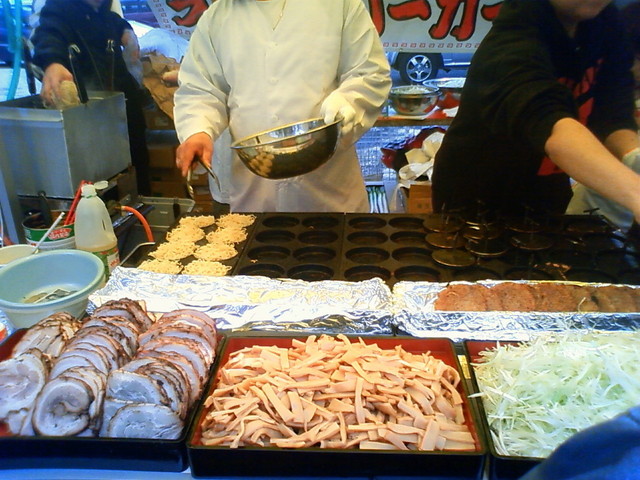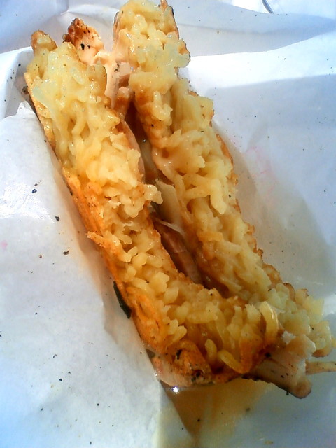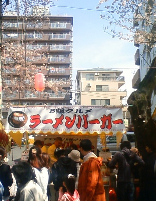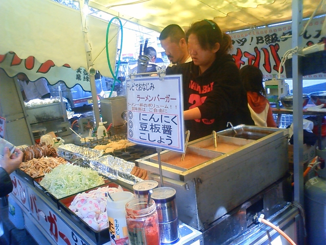 露店もびっしり並んでいますが、その中にラーメンバーガーというのを発見して早速食べて見ました。