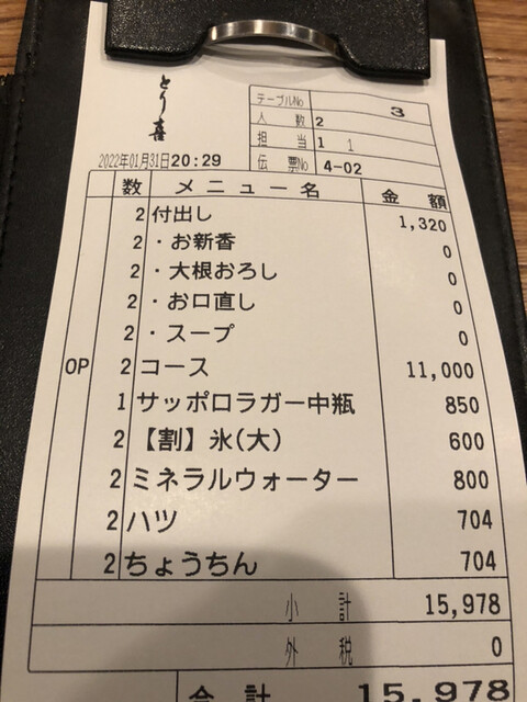 お会計は、一人当たりコース5830円+お通し660円、ヱビスマイスター720円、山崎の水715円に追加の丸ハツとちょうちん2串で704円でした。