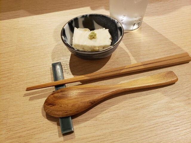 写真はお通しでいただいた「チーズの豆腐仕立て」豆腐と思いきやチーズ、鶏そぼろ?の上に豆腐のようなチーズの二層構造。シッカリした味ですが上品。
