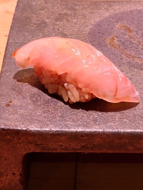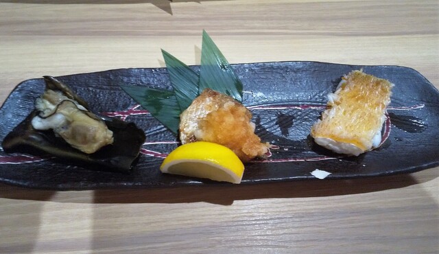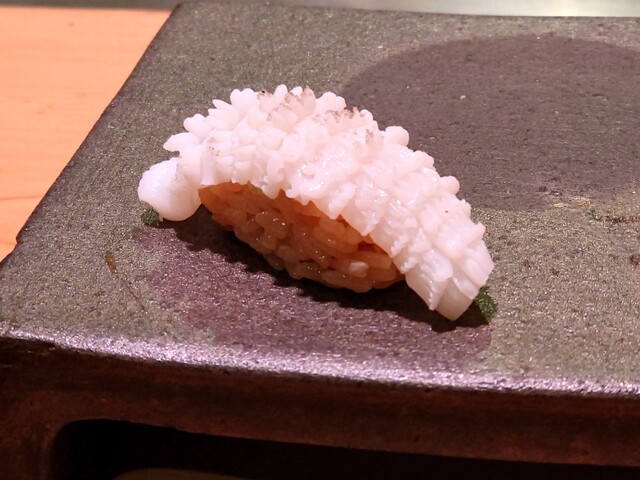 数品つまみが提供され、握りに移行する前に鱧の炙り、白海老の天麩羅、ズワイガニを追加。