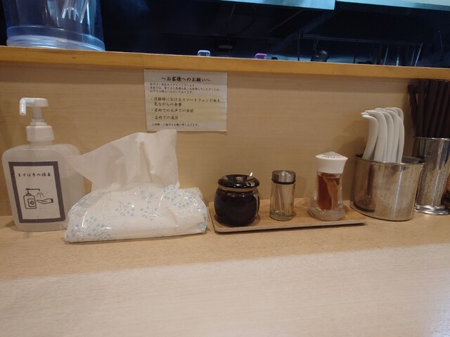 並んで暫くすると店員さんが注文を事前に聞きに来て、その後店内に案内されカウンター席に着席。お店の方はとても丁寧な対応です。