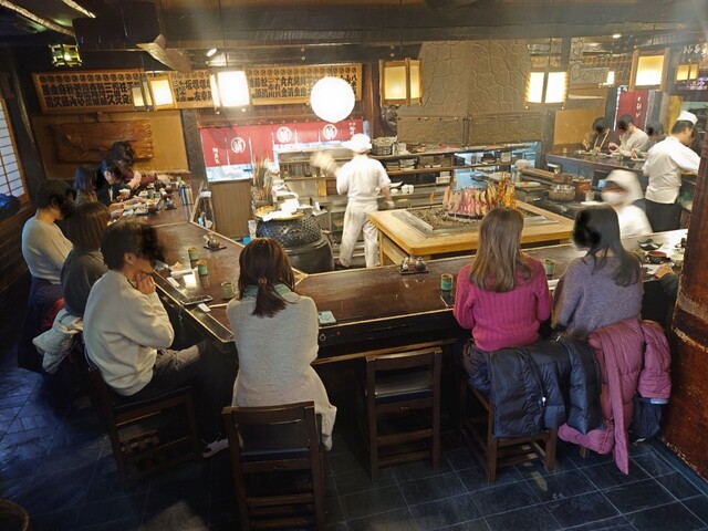コの字型のカウンター席の中央には囲炉裏の周りに魚を並べて焼く「原始焼き」が圧巻です。5~6分ほどで料理が運ばれて来ました。