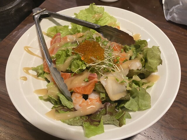 連れがサラダを注文していて、かなりの量のサラダが。魚介サラダ仕立てで、これまたさっぱりと食べれる。