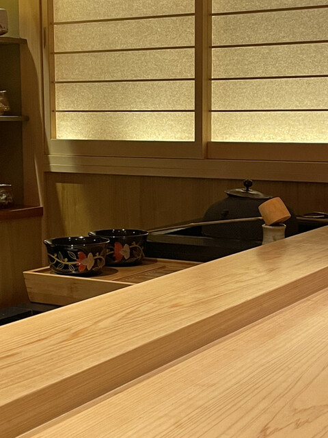 外観から高貴な和の佇まいで入る前から気分も高まります。中に入ると白木のカウンターテーブルで清潔感ある店内です。