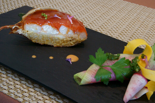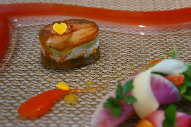 ベースにカリフラワーのムース。ラタトゥイユを挟んでオマール海老。更にオマール海老のコンソメのジュレ。上には菊の花とクレソン、胡麻のフィアンティーヌ。アメリケーヌソース、パプリカのソース。