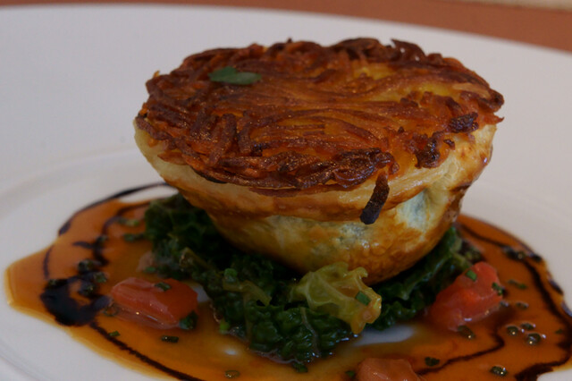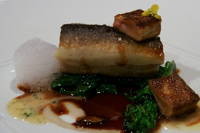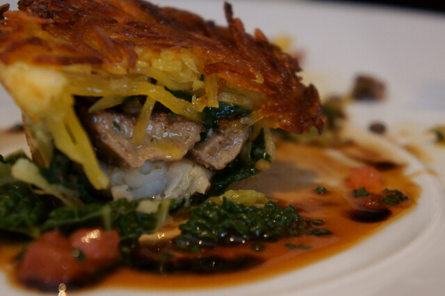 上に乗っかってるインカの目覚めのガレットの下は、パイに包まれた豆キンキと鴨のフォアグラ。底にはちりめんキャベツが敷かれています。ソースはディアブルとバルサミコとなっています。