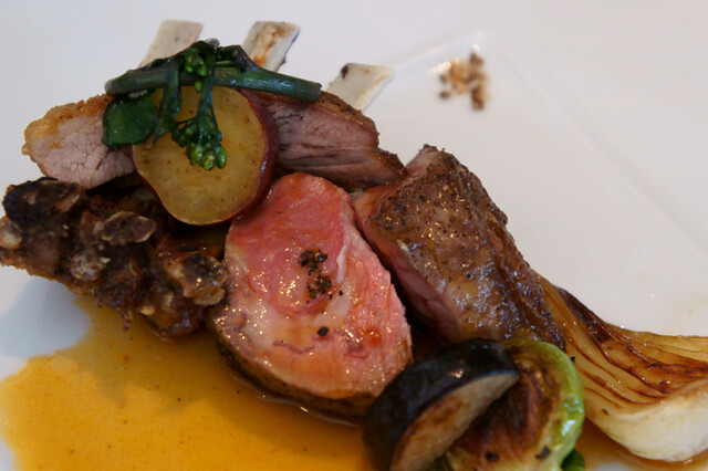 これは文句なしに美味しい。火入れは部位毎にきちっとコントロールされており、食感と炭香加減に変化を持たせています。ソースもよし、臭みの残り具合も絶妙。この皿だけでコース料金の大部分は元が取れます。付け合せは、オニオンヌーボー、芽キャベツ、香菜。
