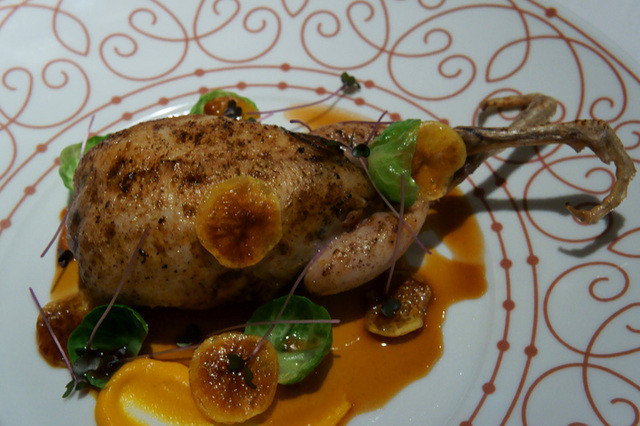 胸肉の上にささみ、手羽に内臓のペーストカナッペ。がっつりのサルミソースが当たり前だけど凄く合う。火入れはしっかり目のミディアムでワインとのバランスも良い。付け合せは、オニオンヌーボー、芽キャベツ、インカの目覚め。写真左下のピジョンの獣香が移った濃厚コンソメも秀逸でした。