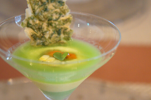 4-1)えんどう豆と玉蜀黍のムース、えんどう豆のジュレ、生うにと少し炙りを入れた玉蜀黍、アオサのフィアンティーヌ