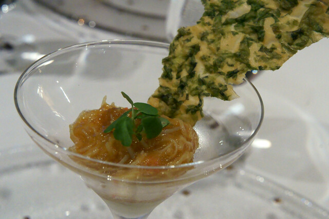 6-1)カリフラワーのムースとズワイガイ、アオサのフィアンティーヌ
