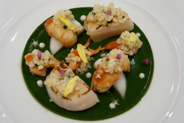 6-2)『阿寒湖産エクルヴィスと気仙沼の帆立貝』ベル・ヴュ仕立て バジルのクーリ