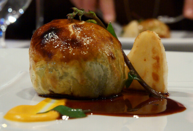 鮑とフォアグラが薄切りハムとほうれん草に包まれています。パイ生地の下にはジャガイモのピューレ。トリュフソース、鮑の肝ソースが添えられています。サクサクのパイを割ると、美味しそうな香りがぷわーっと漂いました。柔らかさとぷりっ感を併せ持った鮑、とろっとしたフォアグラ、旨みを添えるハム、そして、青さを添えるほうれんそう、などなど各素材のバランスが絶妙。そこに肝ソースがガツンと効いています。