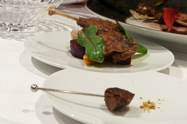 鹿、雉、猪、青首鴨のミンチにフォアグラとピスタチオ。適度な臭み(笑)と色々な食感を楽しめる、肉肉しい一品。ポルト酒をベースにしたジビエのコンソメジュレがまた合っています。ソースは、マスタードとトリュフのヴィネグネットで。付け合せは、ハーブのブーケ。