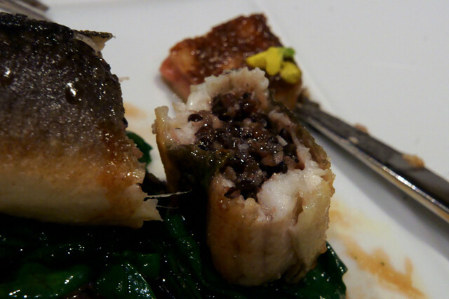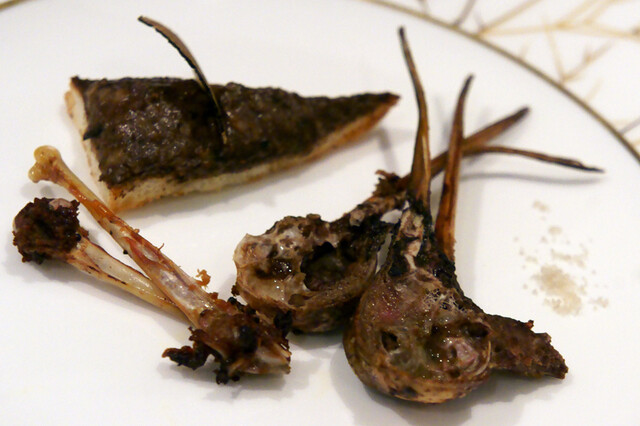 胸肉、ささみ、そして手羽元。火入れはミディアムで濃厚な獣香がします。右側のは、もも肉に内臓のミンチを詰めて煮込んだものです。付け合せは、イタリア産黒キャベツ、セルフィーユの根。トリュフは香りが殆どなかったけど、まあいいか(笑)。
