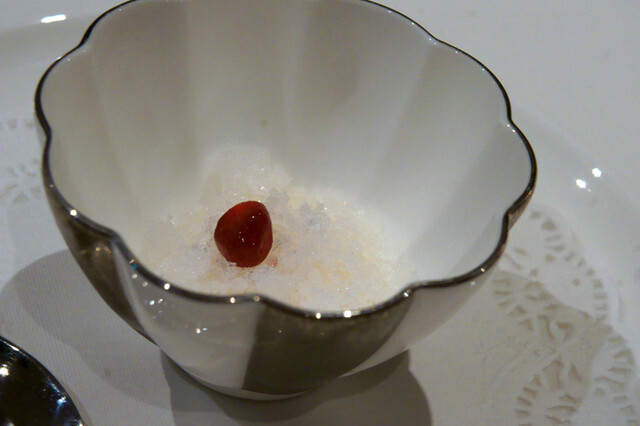 グラニテには柚子が散らされており、石榴と菊花のマリネがちょこん。さらっとした食感。