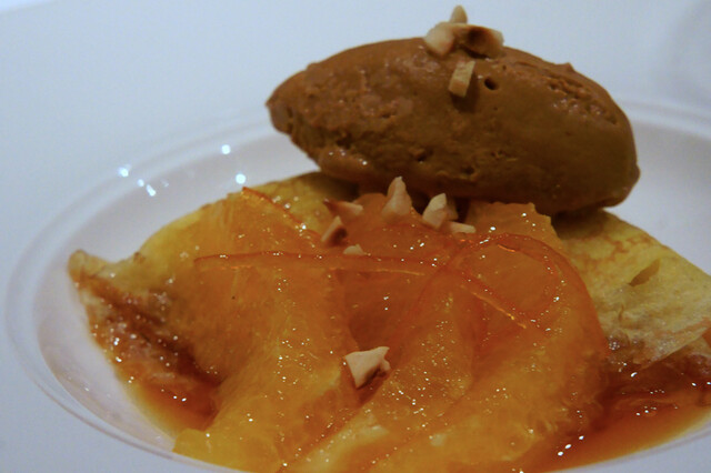 こちらも塩加減、火入れ、ソースがとてもよい感じに仕上がっています。でも、余りにもキレイに仕上がってしまっており、せっかく窒息鴨なのだから、鉄分というか、いい意味での臭みがもう少し欲しかったです。付け合せは、黒キャベツ、プティオニオン、金針菜のつぼみ。付け合せが若干冷え気味なのがちょっと気になりました。