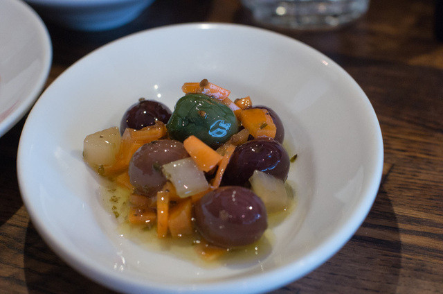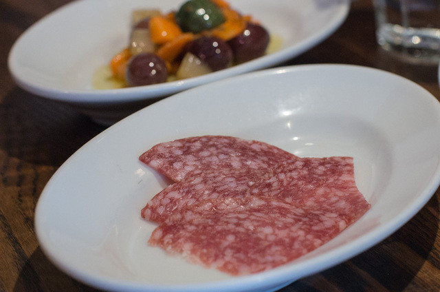 ウイキョウとオリーブのマリネ、サラミ、パン
