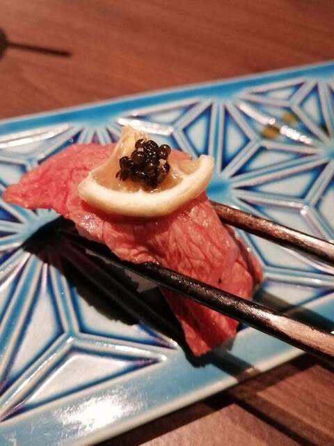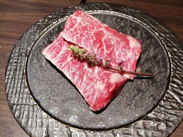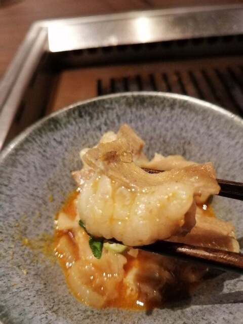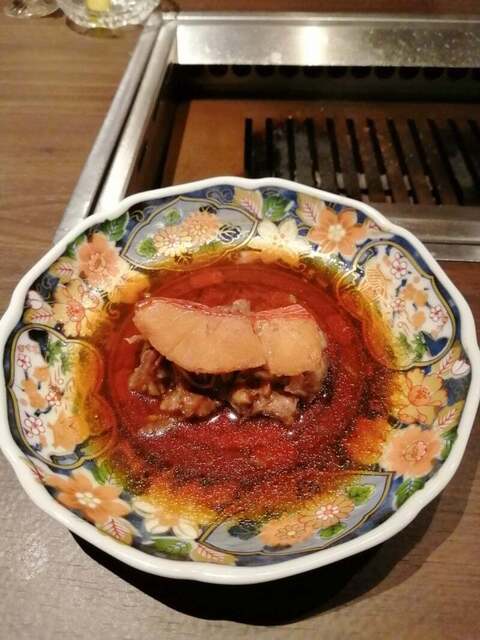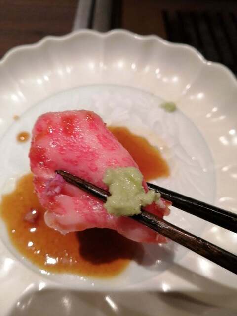 1階と2階があり、個室や半個室なのかな? 肉割烹コースを飲み放題つきで! まず生ビールで乾杯~って泡が柔らかいしビールおいしい~ってことは。。。お料理期待できそう♪ 乾豆腐コンビーフピリ辛和え焼肉屋さんで中国の乾豆腐って初めての経験・・・圧力鍋を使って作ったタンのコンビーフで自家製のラー油を使ってあって後から辛さがくる 次が海鮮なので白ワインを!って、飲み放題でこの白ワイン?はおいしすぎる!!! 海鮮ユッケ コンソメジュレ フランス産キャビアのせこんな美しい料理でてくるなんて♡アボカドとホタテと甘エビも入っているから白ワインともあうあう!!!
