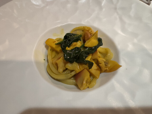 鮑の肝を練り込んだタリオリーニ 鮑と茎わかめ添え