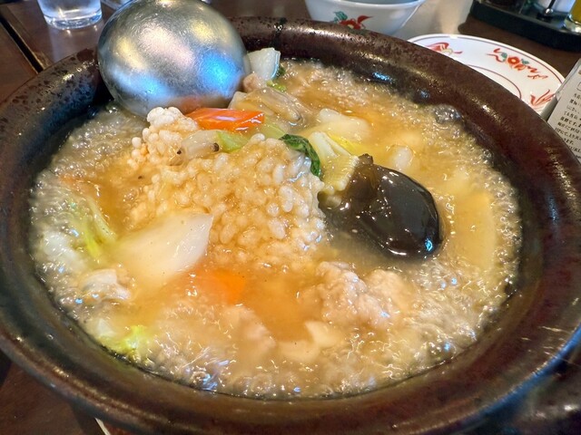 おこげ料理は、お店の方がテーブルに運んでから餡を土鍋に入れてくれるので、ジュワ〜と美味しそうな音がして食欲をそそります。